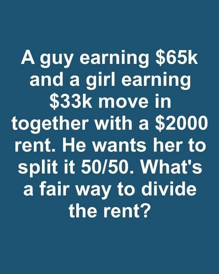 In this scenario, a man earning $65,000 annually and a woman earning $33,000 are faced with a $2,000 monthly rent. The question arises: should they split the rent equally, or is there a more equitable way to divide this expense?